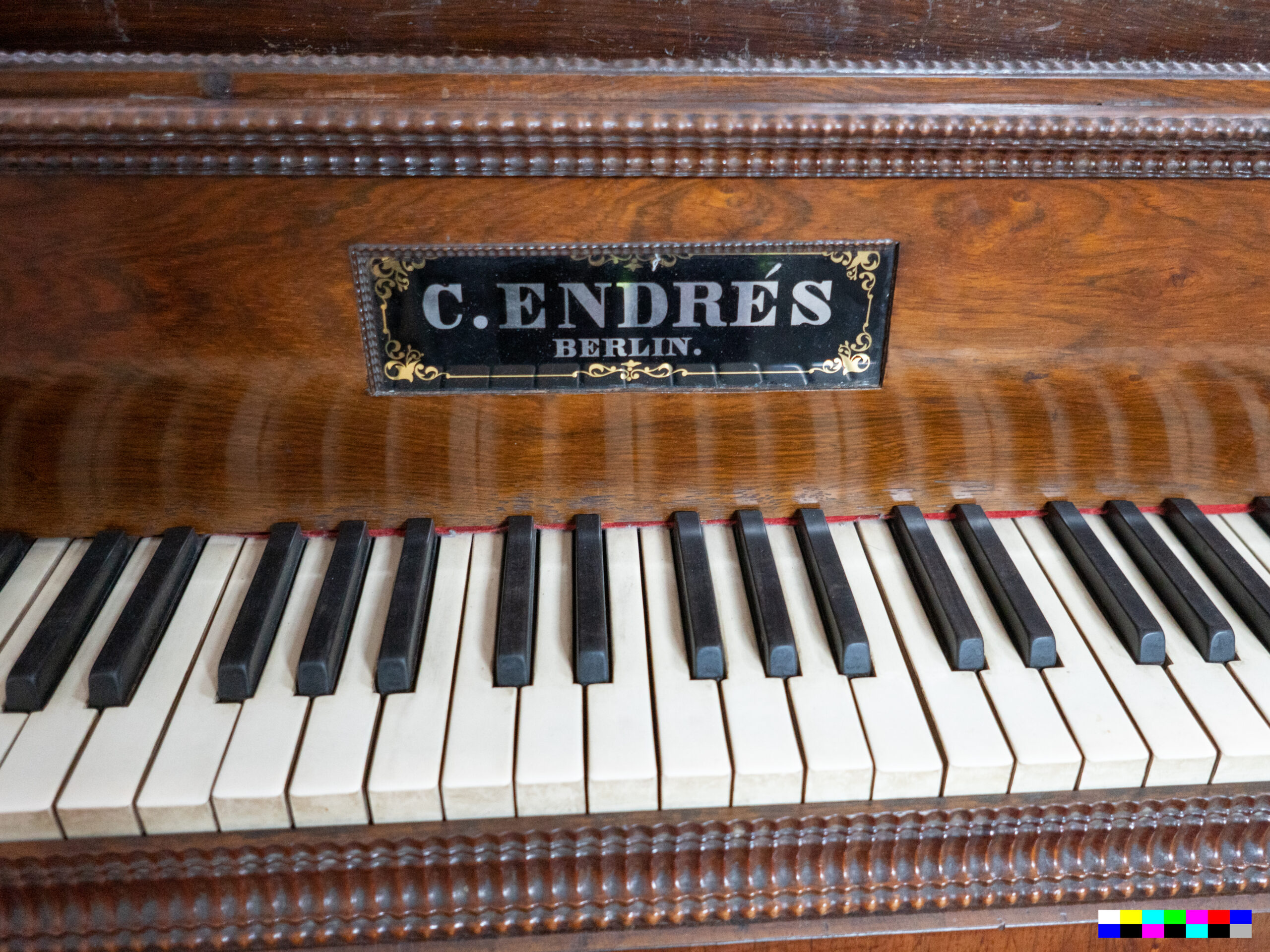 General description: Grand piano by C. Endrés, Berlin, Germany, ca. 1850–1860. Case veneered with rosewood, supported by three legs (one broken). Metal hitchpin plate with four metal bars and a capo tasto in the treble. Triple-strung throughout, with closed wrapped bass strings and remaining strings fitted in agraffes. Viennese-type action with felt hammer heads and felt dampers (“old men’s hat” type). Keyboard without ivory, possibly plastic, with some peeling keys. Two pedals (lyra). Playable but in poor condition. Serial number M11. Inventory number: 3304.