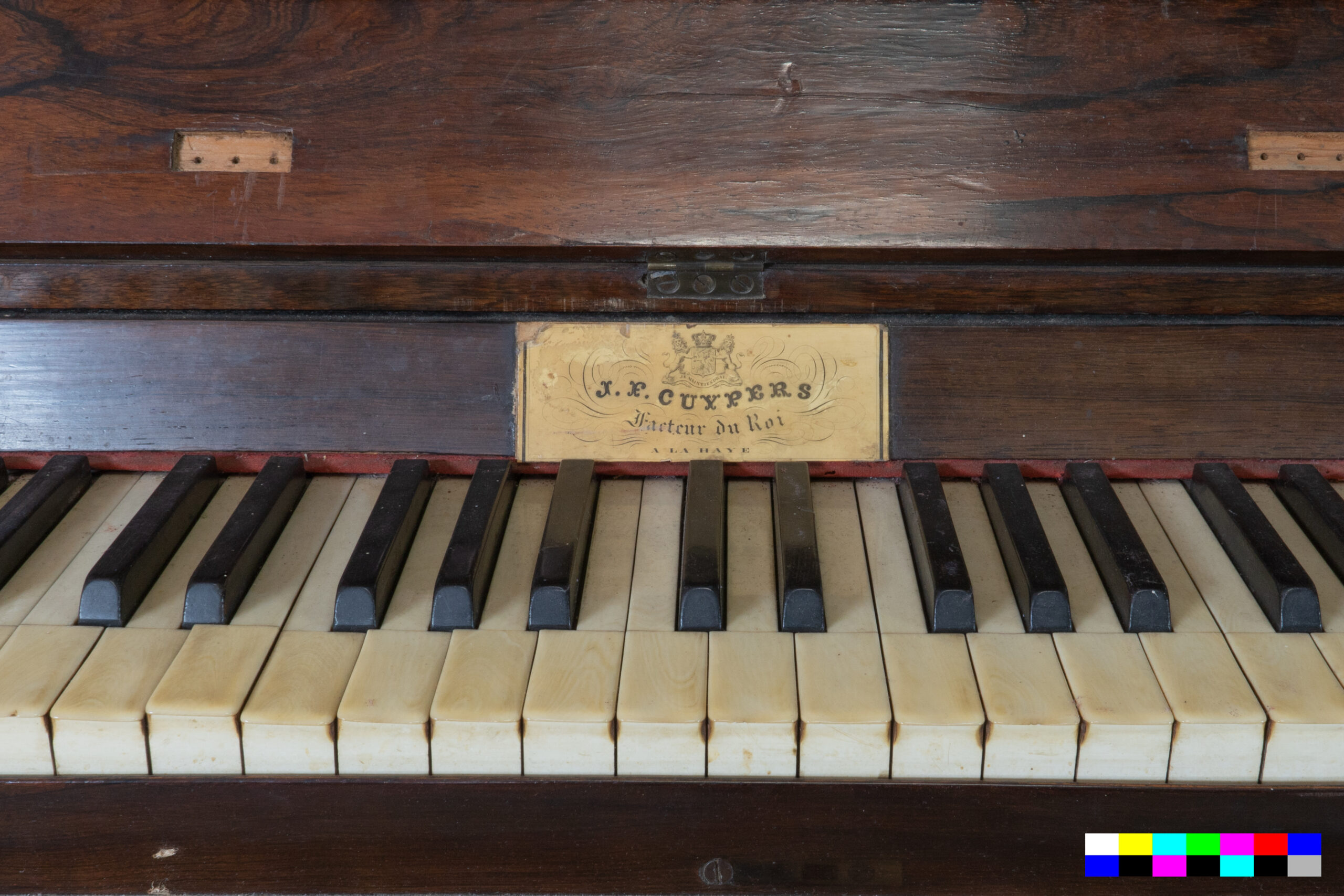 General description: Upright piano by J. F. Cuypers, Facteur du Roi à La Haye, The Hague, Netherlands, ca. 1899. Case with ivory keyboard, brass details partially missing. Compass: AAA–a⁴ (7 octaves). Playable in medium condition. Serial number: 641. Inventory number: P094.